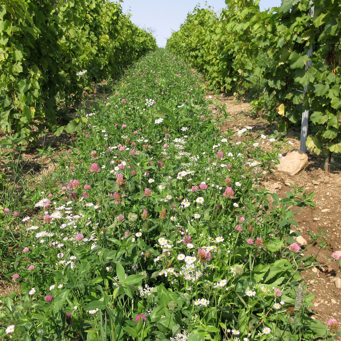 Nous maintenons des bandes florales autour du Vignoble et entre les parcelles de vignes. Ces fleurs sauvages sont des sites nourriciers et des refuges indispensables pour les insectes, acariens et araignées bénéfiques qui assurent la répression naturelle des insectes ravageurs de la vigne.